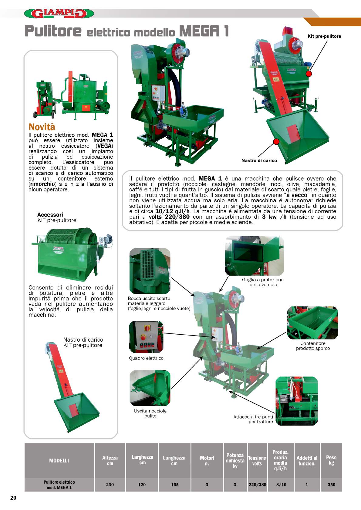 Il pulitore elettrico mod. MEGA 3 è una macchina che pulisce ovvero che separa il prodotto (nocciole, castagne, mandorle, noci, olive, macadamia, caffè e tutti i tipi di frutta in guscio) dal materiale di scarto quale pietre, foglie, legni, frutti vuoti e quant’altro. Il sistema di pulizia avviene “a secco” in quanto non viene utilizzata acqua ma solo aria. La macchina è autonoma: richiede soltanto l’azionamento da parte di un singolo operatore. La capacità di pulizia è di circa 25/30 q.li/h. La macchina è alimentata da una tensione di corrente pari a volts 380 con un assorbimento di 5.5 kw /h. È adatta per piccole e medie aziende.