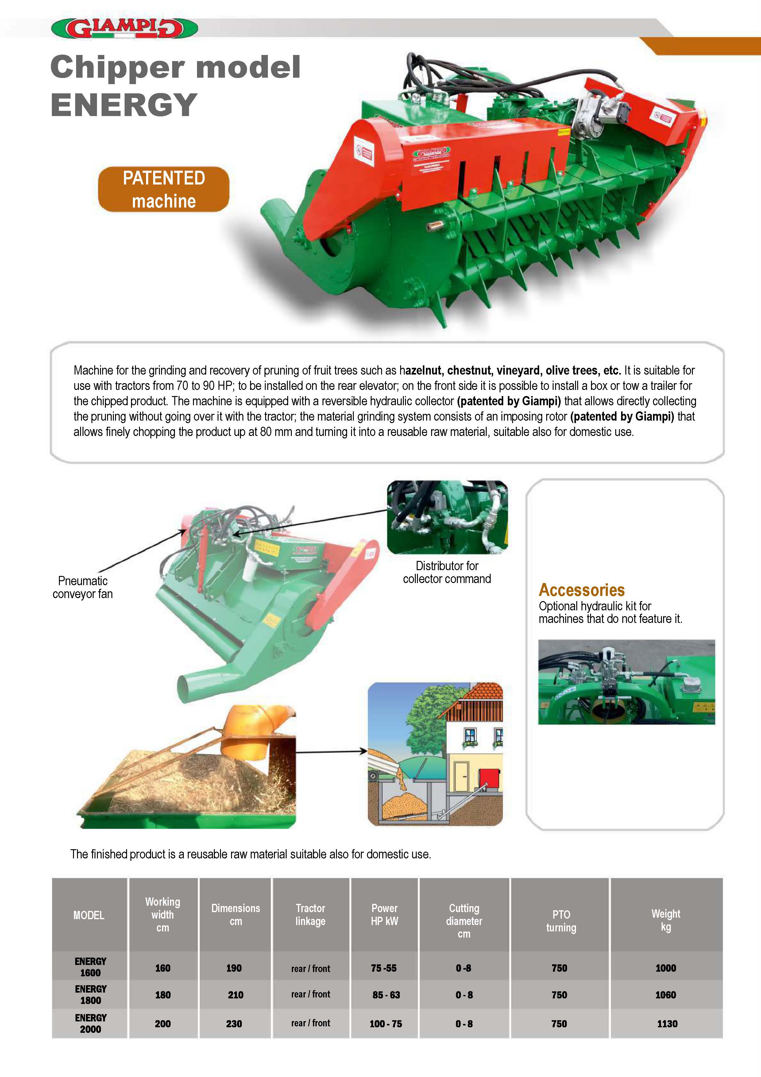 Machine for the grinding and recovery of pruning of fruit trees such as hazelnut, chestnut, vineyard, olive trees, etc. It is suitable for use with tractors from 70 to 90 HP; to be installed on the rear elevator; on the front side it is possible to install a box or tow a trailer for the chipped product. The machine is equipped with a reversible hydraulic collector (patented by Giampi) that allows directly collecting the pruning without going over it with the tractor; the material grinding system consists of an imposing rotor (patented by Giampi) that allows finely chopping the product up at 80 mm and turning it into a reusable raw material, suitable also for domestic use.