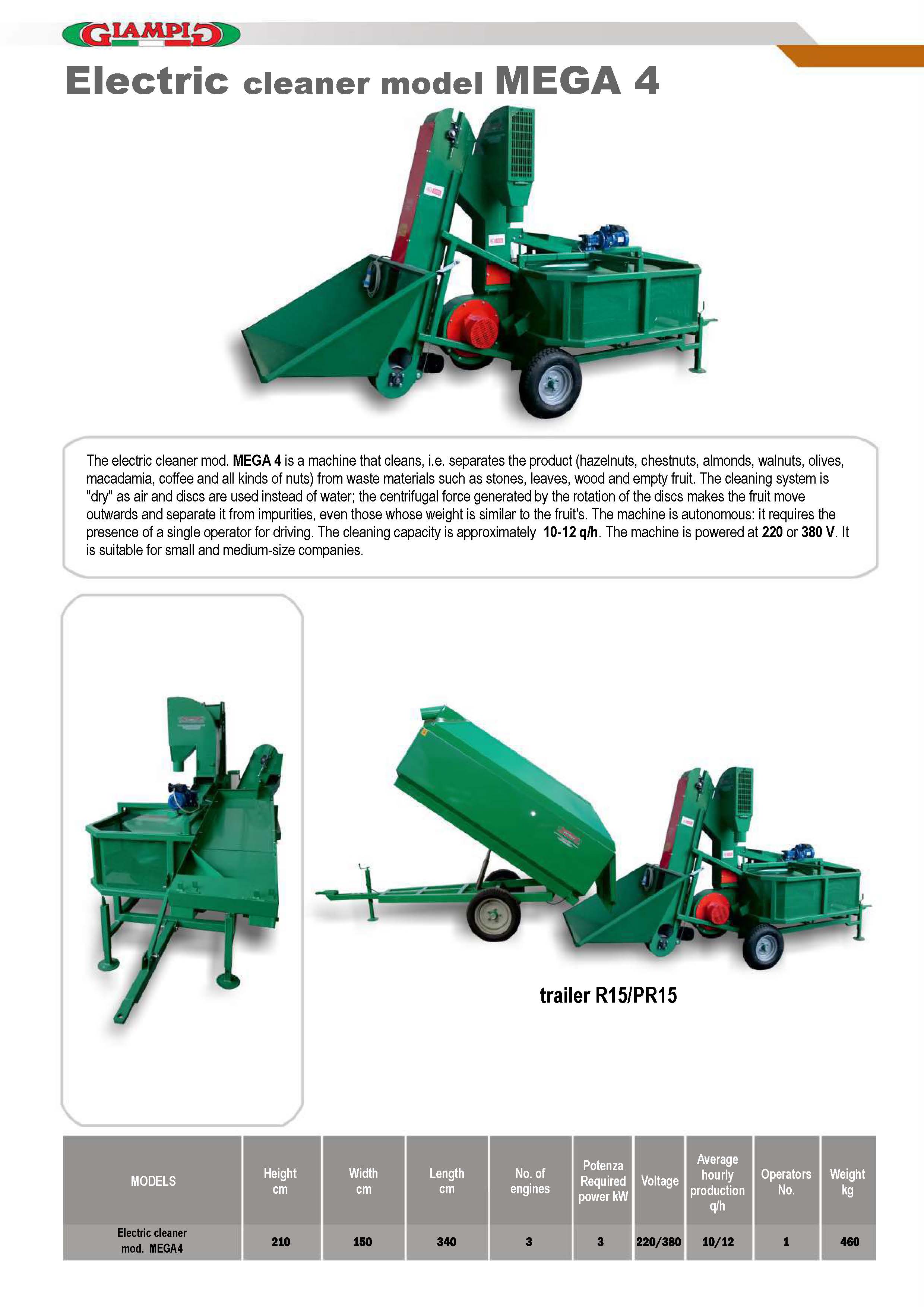 The electric cleaner mod. MEGA 4 is a machine that cleans, i.e. separates the product (hazelnuts, chestnuts, almonds, walnuts, olives, macadamia, coffee and all kinds of nuts) from waste materials such as stones, leaves, wood and empty fruit. The cleaning system is “dry” as air and discs are used instead of water; the centrifugal force generated by the rotation of the discs makes the fruit move outwards and separate it from impurities, even those whose weight is similar to the fruit’s. The machine is autonomous: it requires the presence of a single operator for driving. The cleaning capacity is approximately 10-12 q/h. The machine is powered at 220 or 380 V. It is suitable for small and medium-size companies.