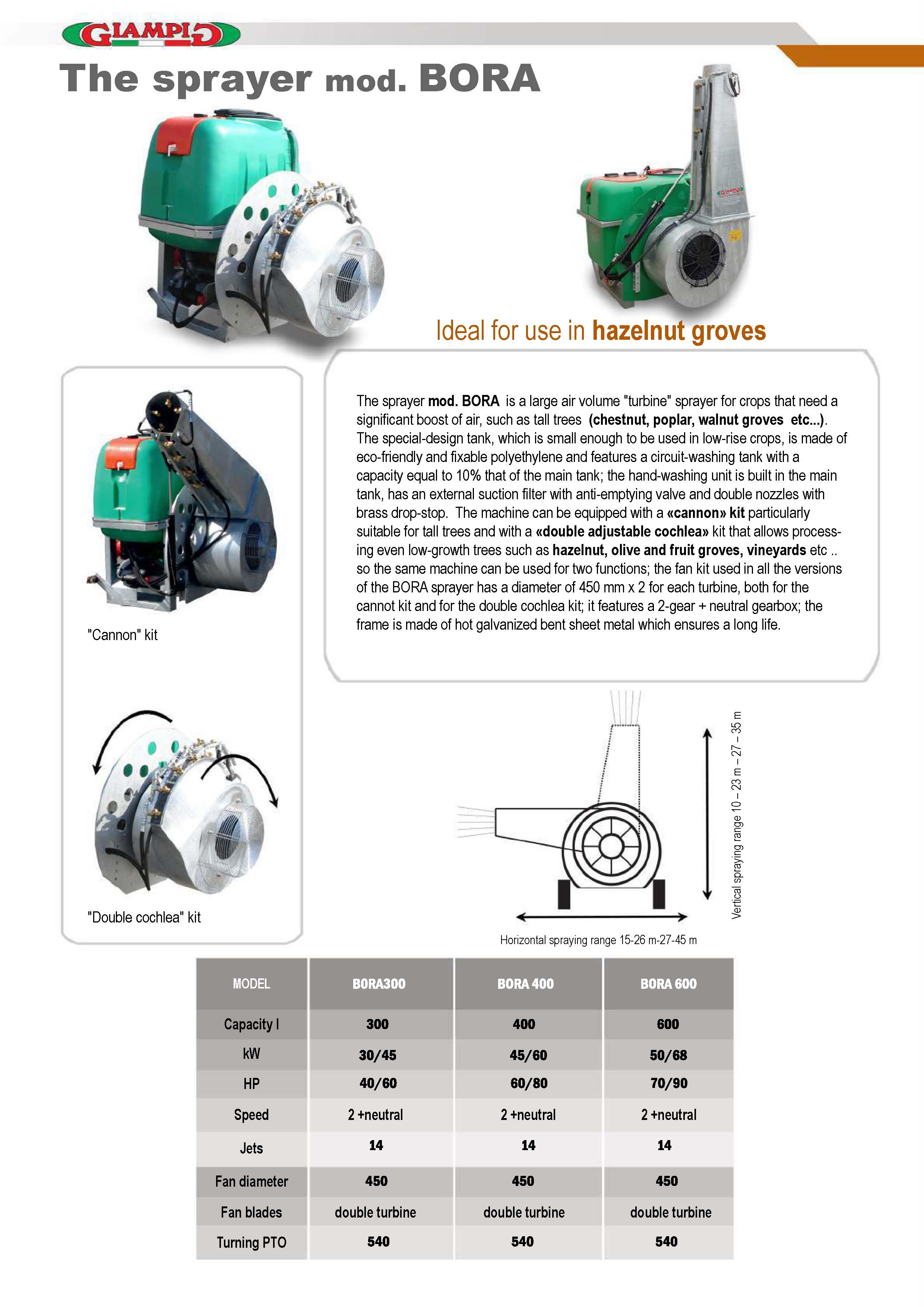 of the BORA sprayer has a diameter of 450 mm x 2 for each turbine, both for the cannot kit and for the double cochlea kit; it features a 2-gear + neutral gearbox; the “Cannon” kit frame is made of hot galvanized bent sheet metal which ensures a long life.