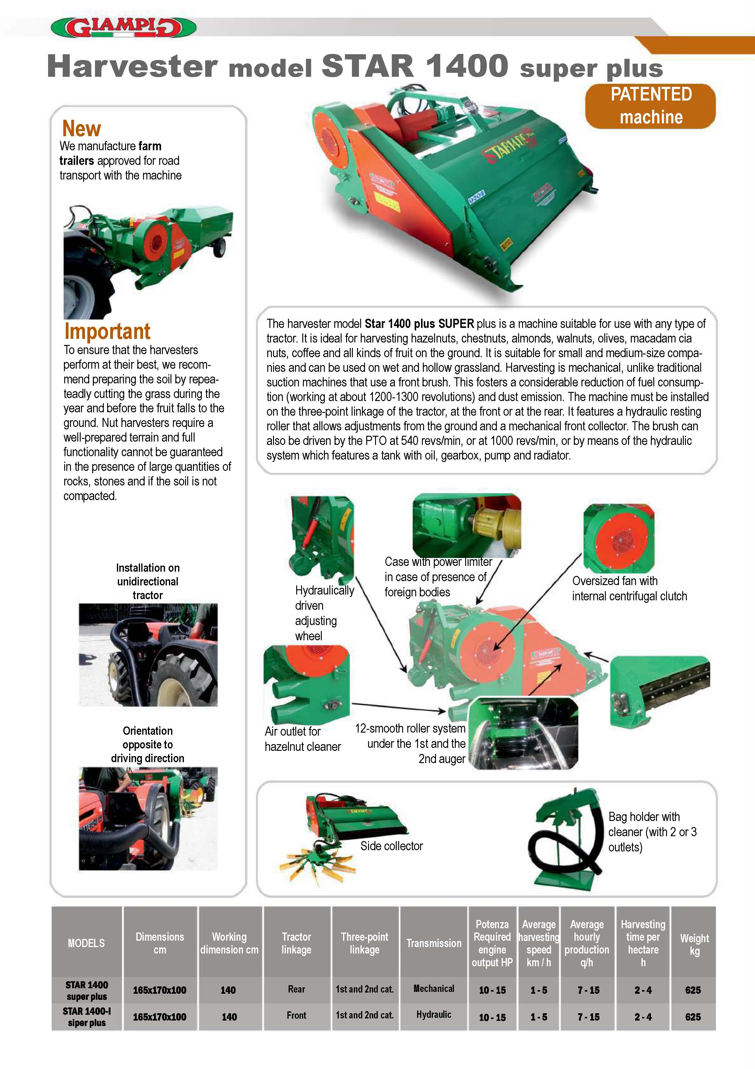 The harvester model Star 1400 plus SUPER plus is a machine suitable for use with any type of tractor. It is ideal for harvesting hazelnuts, chestnuts, almonds, walnuts, olives, macadam cia nuts, coffee and all kinds of fruit on the ground. It is suitable for small and medium-size companies and can be used on wet and hollow grassland. Harvesting is mechanical, unlike traditional suction machines that use a front brush. This fosters a considerable reduction of fuel consumption (working at about 1200-1300 revolutions) and dust emission. The machine must be installed