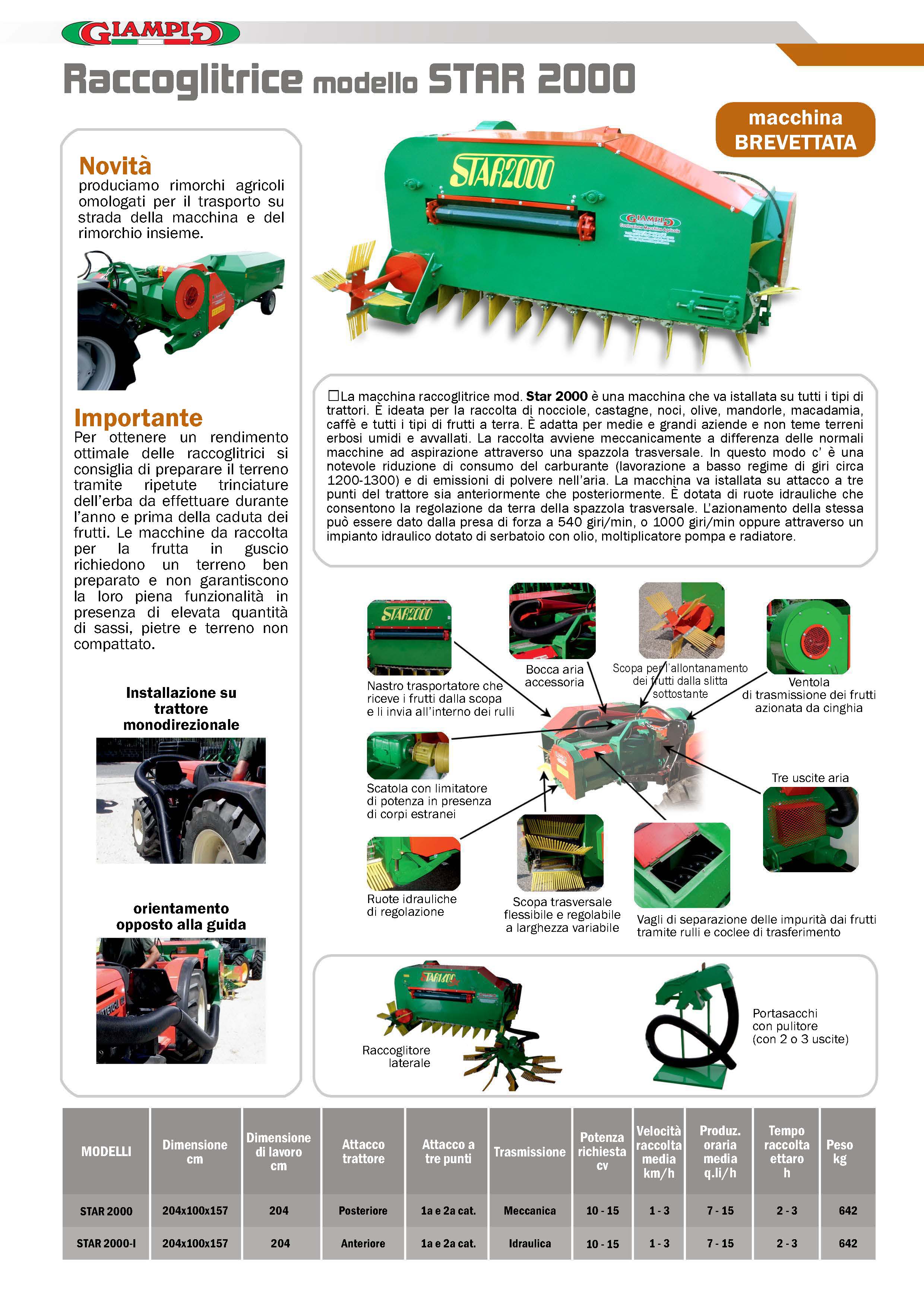 The harvesting machine mod. Star 2000 is a machine that must be installed on all types of tractors. It is designed for the collection of hazelnuts, chestnuts, walnuts, olives, almonds, macadamia, coffee and all types of fruits on the ground. It is suitable for medium and large companies and does not fear damp and ground grasslands. Harvesting takes place mechanically unlike normal suction machines through a cross brush. In this way there is a noticeable reduction in fuel consumption (processing at low rpm around 1200-1300) and emissions of dust in the air. The machine must be installed on the tractor’s three-point hitch both front and rear. It is equipped with water wheels that allow the cross brush to be adjusted from the ground. The operation of the same can be given by the power take-off at 540 rpm, or 1000 rpm or through a hydraulic system with oil tank, pump multiplier and radiator.