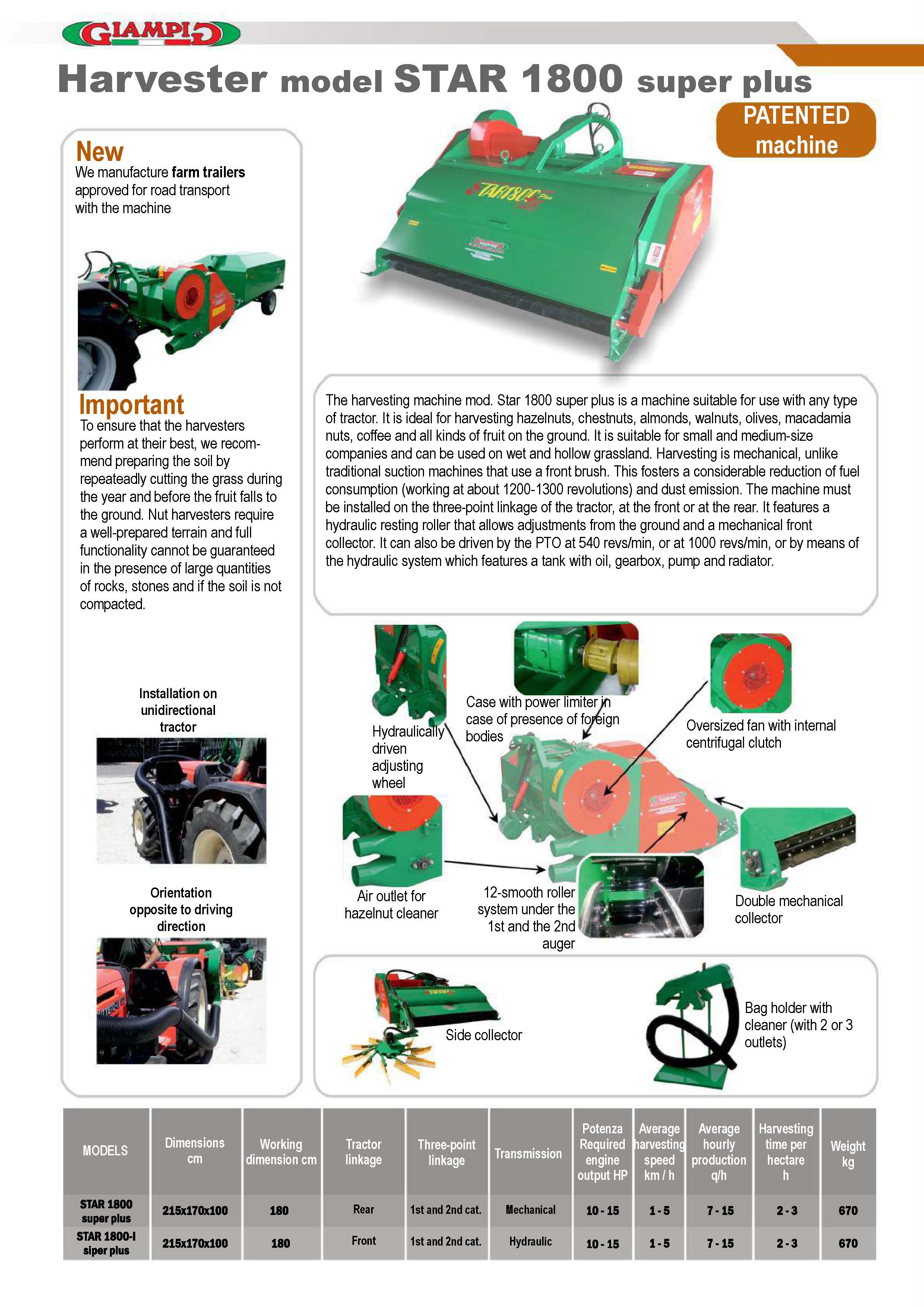 The harvesting machine mod. Star 1800 super plus is a machine suitable for use with any type of tractor. It is ideal for harvesting hazelnuts, chestnuts, almonds, walnuts, olives, macadamia nuts, coffee and all kinds of fruit on the ground. It is suitable for small and medium-size companies and can be used on wet and hollow grassland. Harvesting is mechanical, unlike traditional suction machines that use a front brush. This fosters a considerable reduction of fuel consumption (working at about 1200-1300 revolutions) and dust emission. The machine must be installed on the three-point linkage of the tractor, at the front or at the rear. It features a hydraulic resting roller that allows adjustments from the ground and a mechanical front collector. It can also be driven by the PTO at 540 revs/min, or at 1000 revs/min, or by means of the hydraulic system which features a tank with oil, gearbox, pump and radiator.