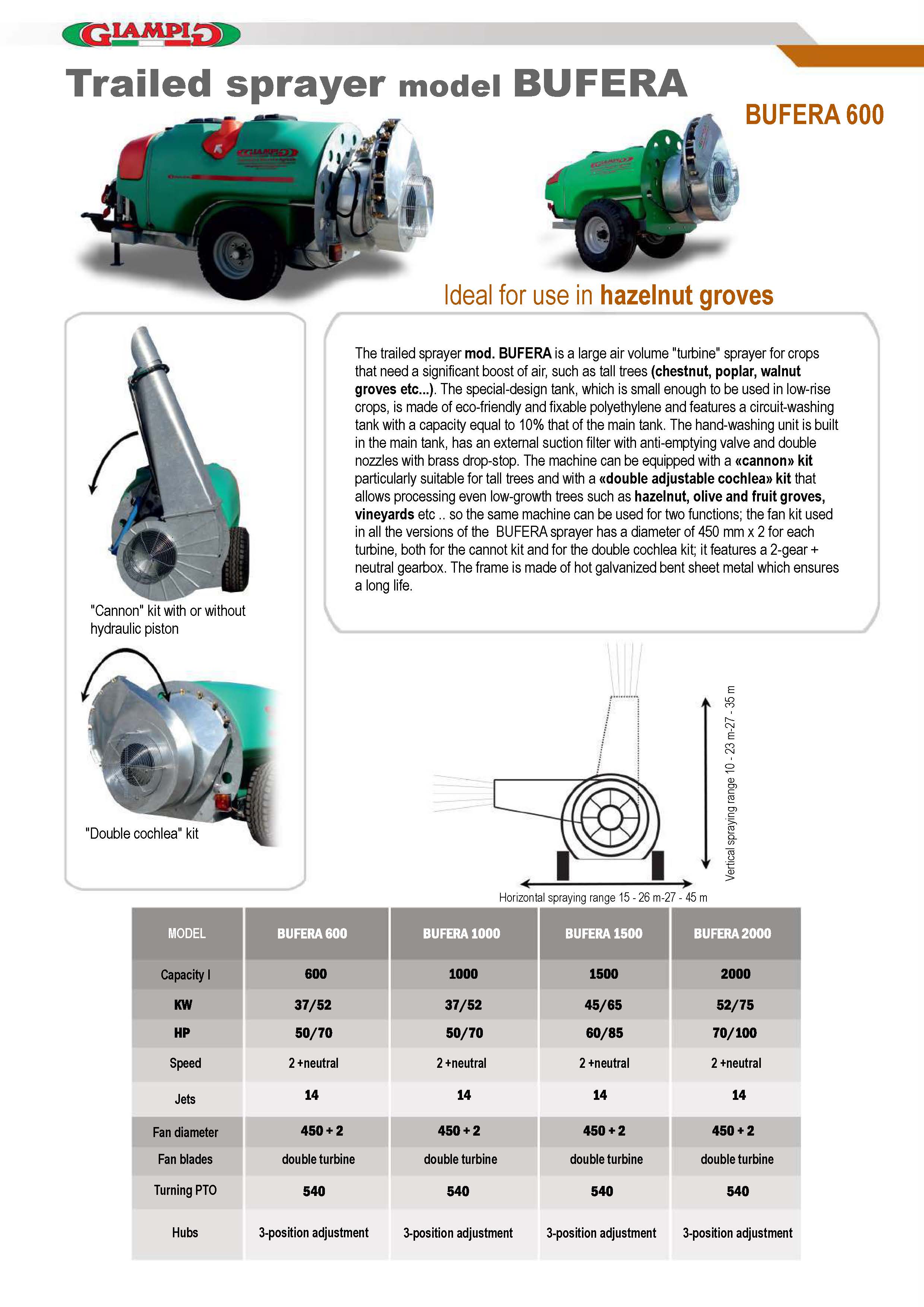 groves etc…). The special-design tank, which is small enough to be used in low-rise crops, is made of eco-friendly and fixable polyethylene and features a circuit-washing tank with a capacity equal to 10% that of the main tank. The hand-washing unit is built in the main tank, has an external suction filter with anti-emptying valve and double nozzles with brass drop-stop. The machine can be equipped with a «cannon» kit particularly suitable for tall trees and with a «double adjustable cochlea» kit that allows processing even low-growth trees such as hazelnut, olive and fruit groves, vineyards etc .. so the same machine can be used for two functions; the fan kit used in all the versions of the BUFERA sprayer has a diameter of 450 mm x 2 for each turbine, both for the cannot kit and for the double cochlea kit; it features a 2-gear + neutral gearbox. The frame is made of hot galvanized bent sheet metal which ensures a long life.