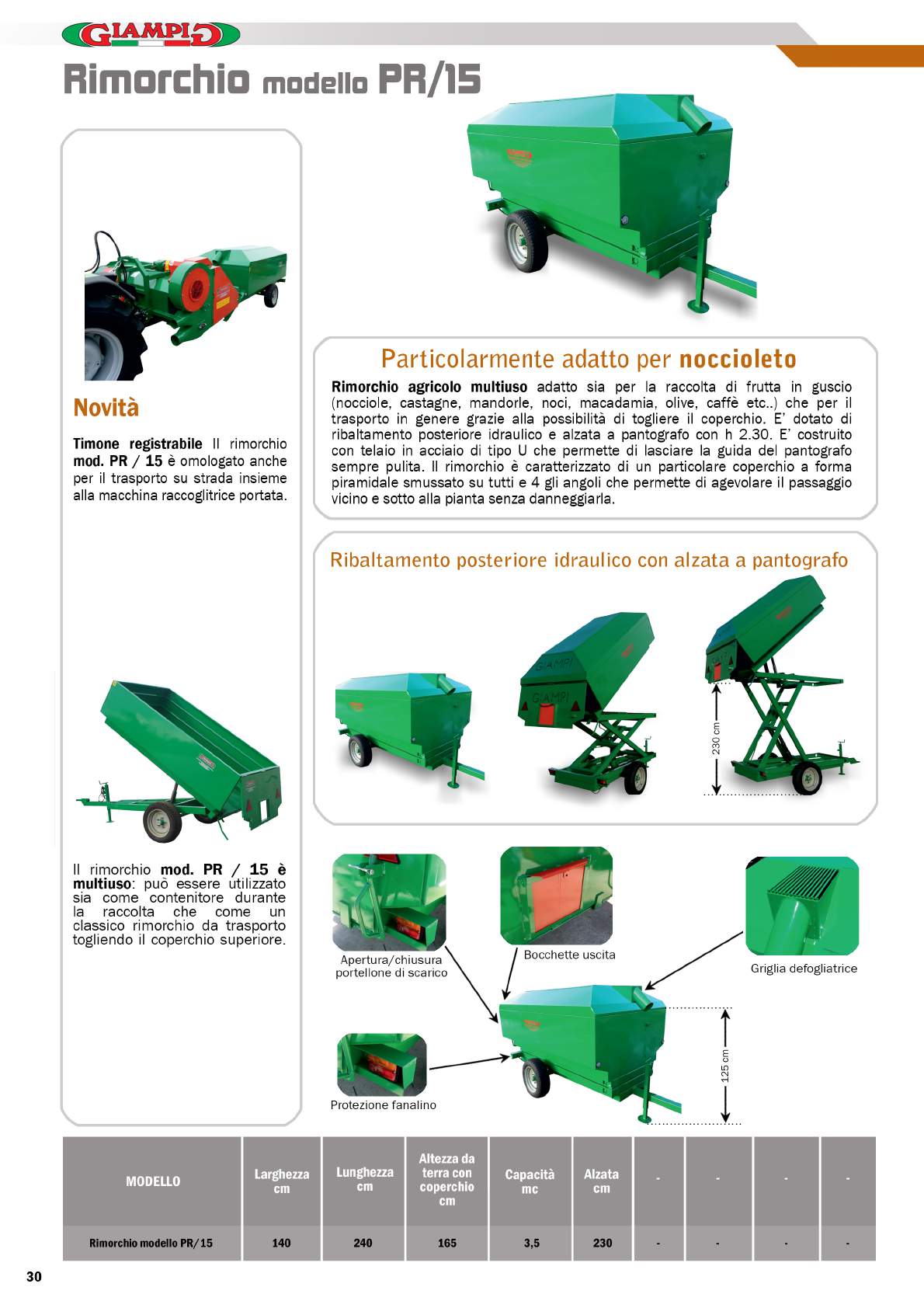 Rimorchio agricolo multiuso adatto sia per la raccolta di frutta in guscio (nocciole, castagne, mandorle, noci, macadamia, olive, caffè etc..) che per il trasporto in genere grazie alla possibilità di togliere il coperchio. E’ dotato di ribaltamento posteriore idraulico e alzata a pantografo con h 2.30. E’ costruito con telaio in acciaio di tipo U che permette di lasciare la guida del pantografo sempre pulita. Il rimorchio è caratterizzato di un particolare coperchio a forma piramidale smussato su tutti e 4 gli angoli che permette di agevolare il passaggio