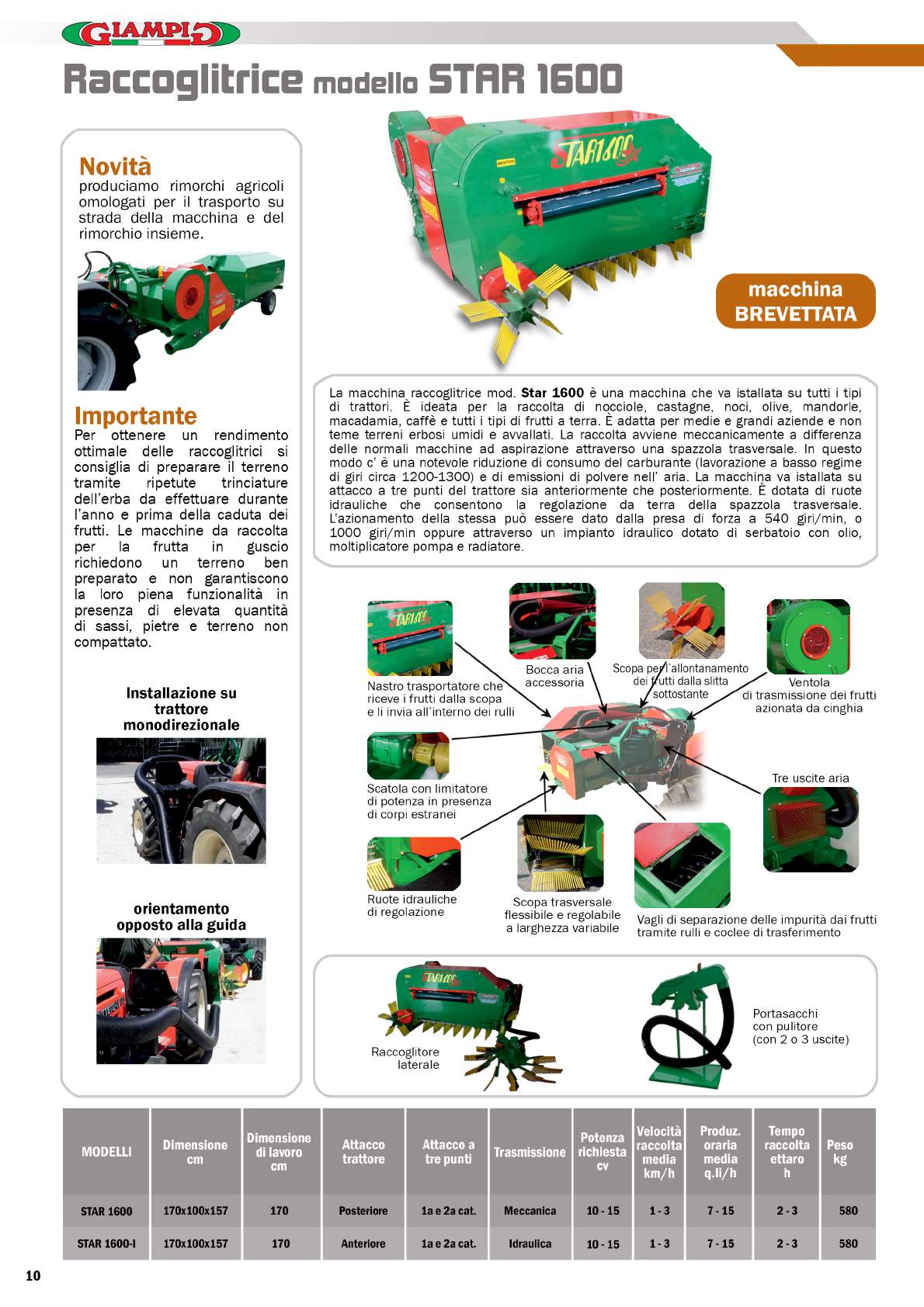 La macchina raccoglitrice mod. Star 1600 è una macchina che va istallata su tutti i tipi di trattori. È ideata per la raccolta di nocciole, castagne, noci, olive, mandorle, macadamia, caffè e tutti i tipi di frutti a terra. È adatta per medie e grandi aziende e non teme terreni erbosi umidi e avvallati. La raccolta avviene meccanicamente a differenza delle normali macchine ad aspirazione attraverso una spazzola trasversale. In questo modo c’ è una notevole riduzione di consumo del carburante (lavorazione a basso regime di giri circa 1200-1300) e di emissioni di polvere nell’ aria. La macchina va istallata su attacco a tre punti del trattore sia anteriormente che posteriormente. È dotata di ruote idrauliche che consentono la regolazione da terra della spazzola trasversale. L’azionamento della stessa può essere dato dalla presa di forza a 540 giri/min, o 1000 giri/min oppure attraverso un impianto idraulico dotato di serbatoio con olio, moltiplicatore pompa e radiatore.