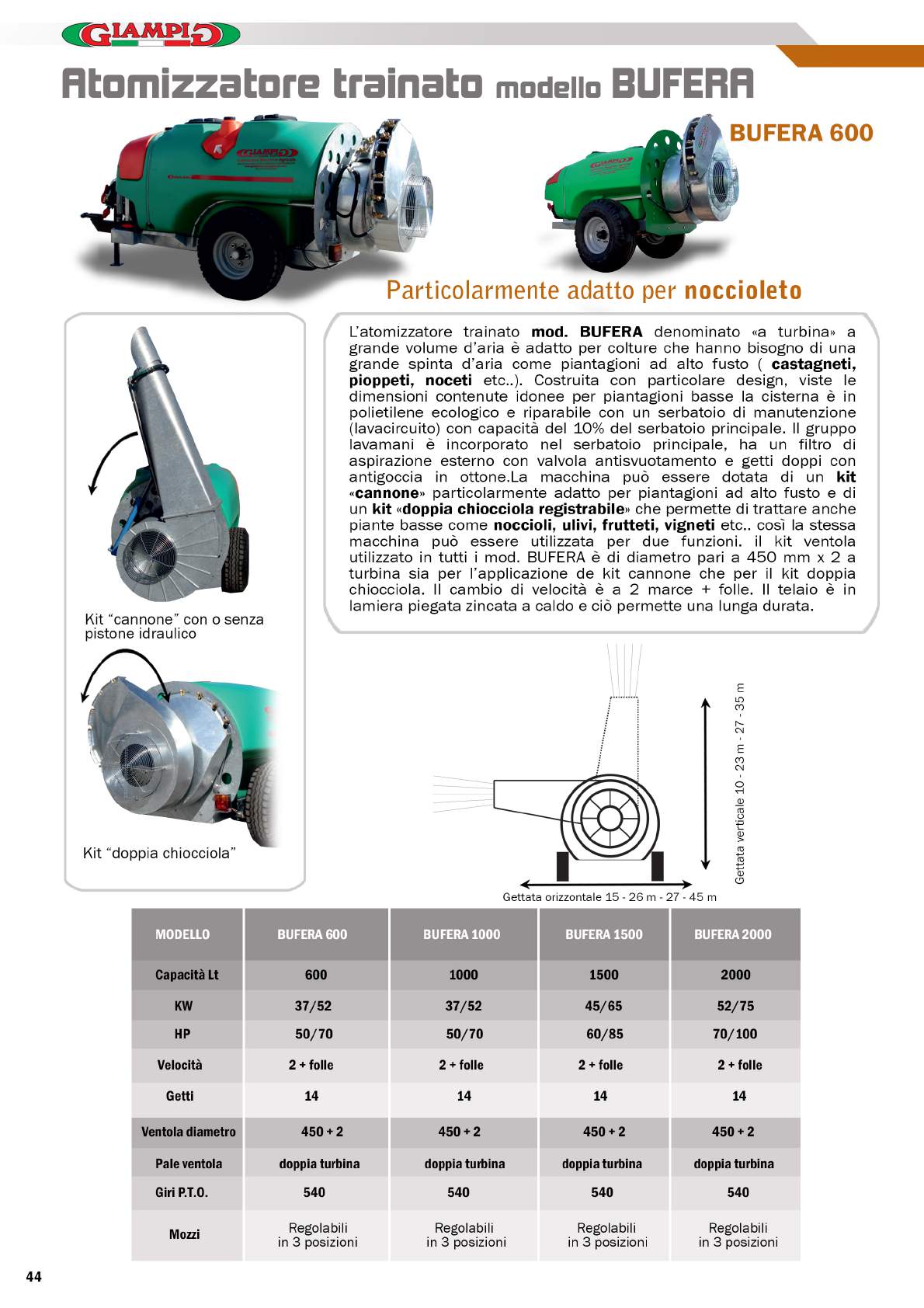 grande volume d’aria è adatto per colture che hanno bisogno di una grande spinta d’aria come piantagioni ad alto fusto ( castagneti, pioppeti, noceti etc..). Costruita con particolare design, viste le dimensioni contenute idonee per piantagioni basse la cisterna è in polietilene ecologico e riparabile con un serbatoio di manutenzione (lavacircuito) con capacità del 10% del serbatoio principale. Il gruppo lavamani è incorporato nel serbatoio principale, ha un filtro di aspirazione esterno con valvola antisvuotamento e getti doppi con antigoccia in ottone.La macchina può essere dotata di un kit «cannone» particolarmente adatto per piantagioni ad alto fusto e di un kit «doppia chiocciola registrabile» che permette di trattare anche piante basse come noccioli, ulivi, frutteti, vigneti etc.. così la stessa macchina può essere utilizzata per due funzioni. il kit ventola utilizzato in tutti i mod. BUFERA è di diametro pari a 450 mm x 2 a turbina sia per l’applicazione de kit cannone che per il kit doppia chiocciola. Il cambio di velocità è a 2 marce + folle. Il telaio è in lamiera piegata zincata a caldo e ciò permette una lunga durata